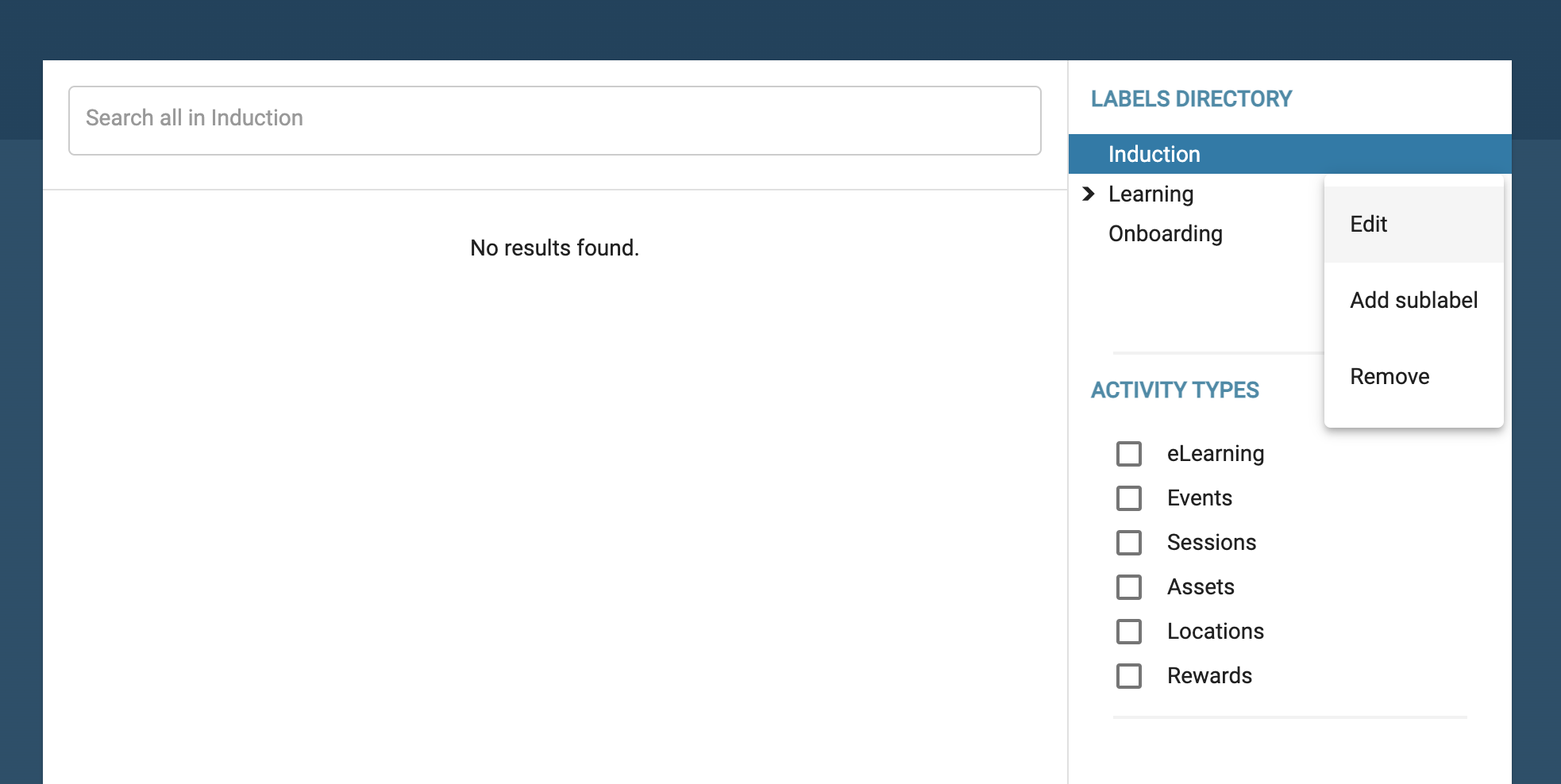 By default all labels are considered organisation-wide unless set to private – this means anyone who has admin privileges to the Activities screen will see all labels and activities. You can change this behaviour by hovering over a label, clicking the 3 dots that appear and selecting Edit.