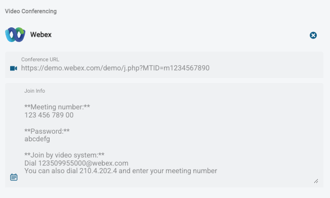 When saving the session, the WebEx integration will automatically schedule a WebEx meeting for the same date and time and attach the conferencing URL and join information to the session: