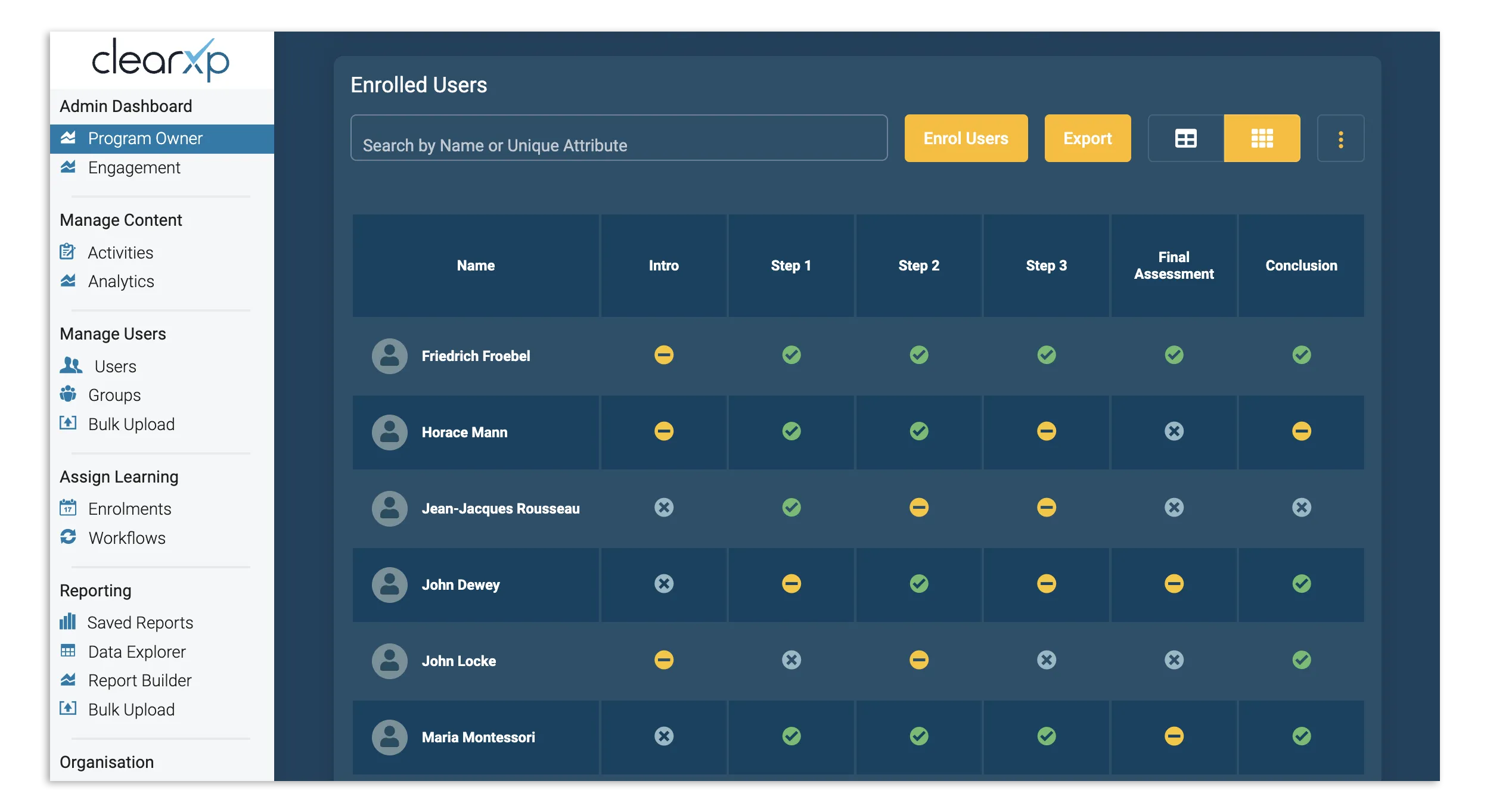 * A new *Pivot* view can be enabled for program compliance and completion reports. This view shows a grid of completion statuses for each step in the pathway for all users, making it much easier to see how far through a program each learner is.