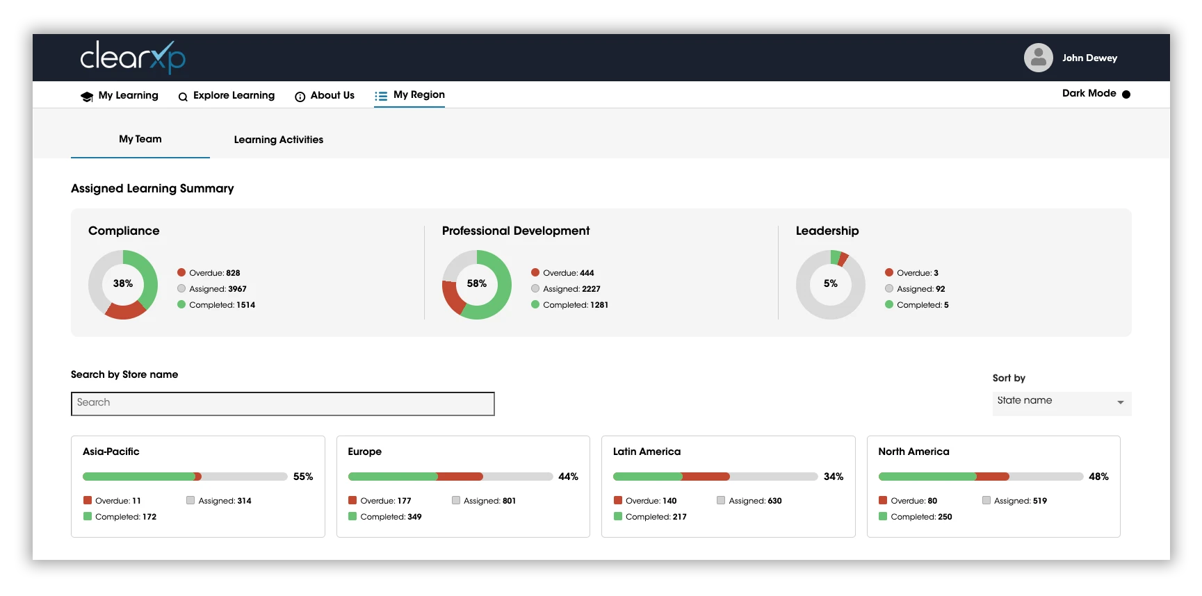 * Each region is shown in a table layout with their overall completion percentage. Each region can be drilled into to see the team-specific dashboard.